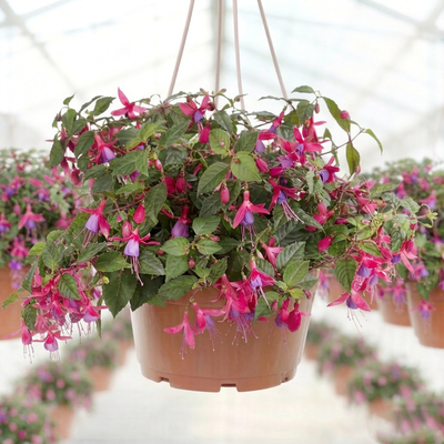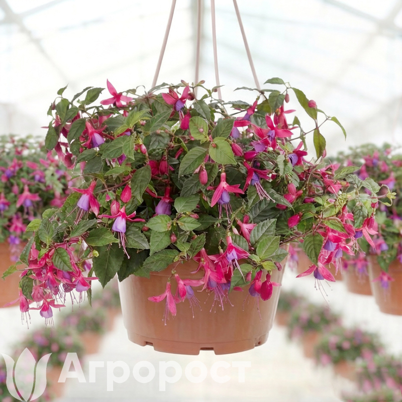 Фуксия ампельная (Fuchsia hybrida) — это многолетнее растение семейства Кипрейные, которое в природе произрастает в тропических областях Центральной и Южной Америки . В нашем кашпо представлены лучшие гибридные сорта, отличающиеся обильным и продолжительным цветением. Существует множество сортов ампельной фуксии, различающихся окраской и формой цветков: от классических красных и розовых до нежно-сиреневых и многоцветных вариантов. Например, сорт Annabel отличается махровыми белоснежными цветками, Bella Rosella — крупными махровыми соцветиями с розовыми чашелистиками и сиреневой юбочкой, а Multa — обильным каскадным цветением с длиной побегов до 60 см .