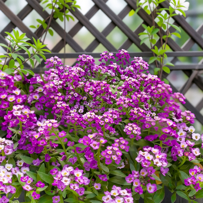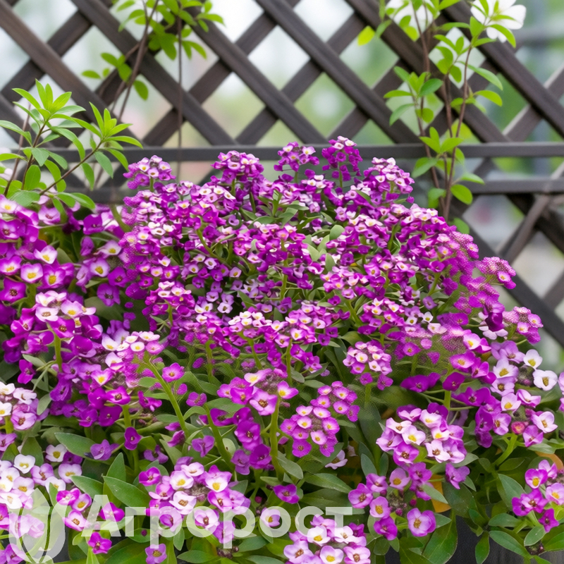 Алиссум (лобулярия морская) — низкорослое почвопокровное растение высотой 10-30 см, образующее плотные цветущие куртины. Листья узкие, серовато-зеленые, во время цветения практически не видны под шапкой соцветий. Мелкие четырехлепестковые цветки собраны в густые кистевидные соцветия и источают сильный медовый аромат, привлекающий пчел и чувствующийся за несколько метров. В ассортименте представлены четыре оттенка: белоснежный "Снежный ковер", нежно-розовый "Розовая королева", лавандовый (серия Clear Crystal) и насыщенный фиолетовый "Фиолетовая королева". Период цветения: с июня по октябрь, до устойчивых заморозков.
