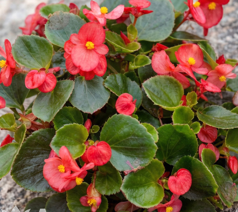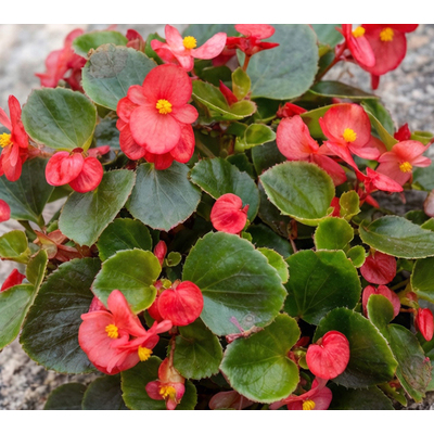 Бегония вечноцветущая красная на зеленом листе — яркие, насыщенно-красные цветы, создающие эффектные акценты.