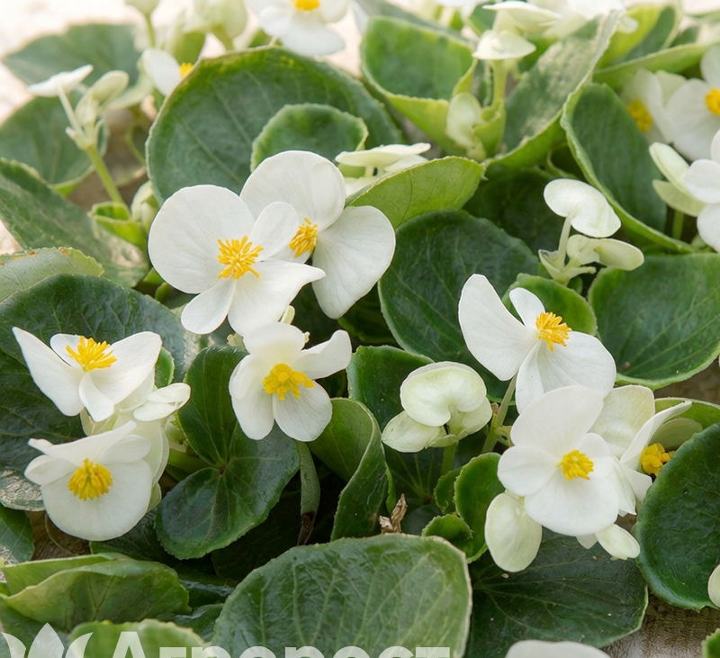 Бегония вечноцветущая белая на зеленом листе — нежные, чисто-белые цветы для светлых, нарядных композиций.