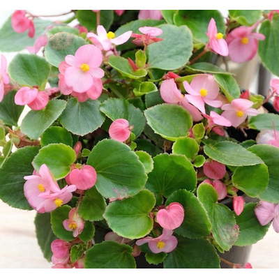 Бегония вечноцветущая розовая на зеленом листе — мягкие, пастельно-розовые оттенки для романтичных уголков сада.