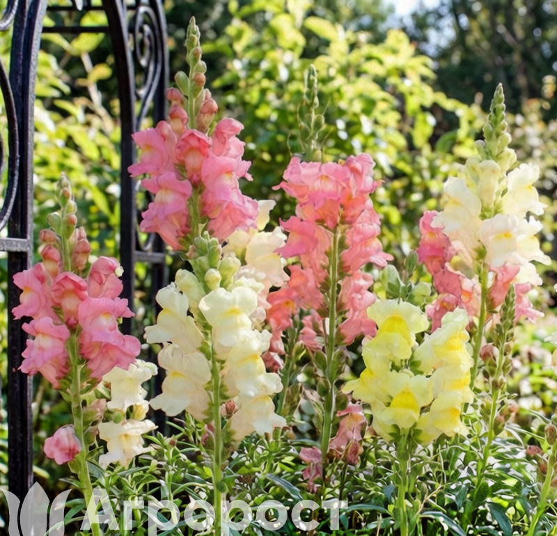 Львиный зев (Antirrhinum majus) — многолетнее растение семейства Подорожниковые, которое в условиях Центральной России выращивают как однолетник . В народе его часто называют «собачками» из-за оригинальной формы цветков, напоминающих пасть льва . Образует прямостоячие, густоветвистые кусты высотой 40-60 см . Листья ланцетные, зеленые. Цветки собраны в эффектные кистевидные соцветия длиной до 20-30 см, обладают приятным ароматом, привлекающим пчел и бабочек . В нашем ассортименте представлен микс окрасок: белые, желтые, оранжевые, розовые, красные, малиновые, бордовые, фиолетовые оттенки, включая двуцветные варианты . Период цветения: с июня по октябрь, до устойчивых заморозков . Растения светолюбивые, холодостойкие, выдерживают легкие заморозки, предпочитают плодородные суглинистые почвы .