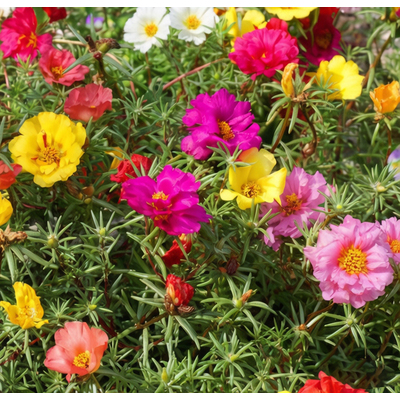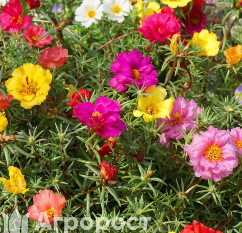 Портулак крупноцветковый (Portulaca grandiflora) — однолетнее почвопокровное растение семейства Портулаковые, родом из Южной Америки . Образует стелющиеся, мясистые, сочные побеги длиной 10-15 см, которые быстро разрастаются в ширину, создавая плотный ковер . Листья мелкие, цилиндрические, мясистые, похожие на маленькие суккуленты, способные накапливать влагу . Цветки одиночные, чашевидные, диаметром 3-6 см, могут быть простыми, полумахровыми или махровыми . Особенность портулака — цветы раскрываются только в солнечную погоду, закрываясь на ночь и в пасмурные дни . В нашем ассортименте представлен микс окрасок: ярко-желтые, оранжевые, красные, розовые, белые, малиновые, сиреневые оттенки, включая двуцветные варианты и сорта с контрастной окраской . Период цветения: с июня по октябрь, до устойчивых заморозков. Растения исключительно светолюбивые, засухоустойчивые, нетребовательные к почвам, предпочитают бедные песчаные грунты .