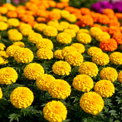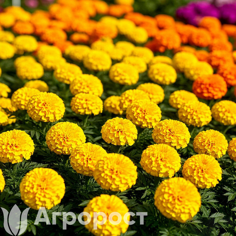 Бархатцы прямостоячие (Tagetes erecta), также известные как африканские бархатцы, — однолетние растения семейства Астровые, родом из Мексики . Образуют мощные, прямостоячие, густоветвистые кусты . Стебли прочные, ребристые, с боковыми побегами, направленными вверх. Листья перисто-рассеченные, темно-зеленые, с характерным пряным ароматом, обусловленным содержанием эфирных масел . Главное достоинство — крупные махровые соцветия-корзинки диаметром 8-12 см, по форме напоминающие шары или полусферы. Соцветия могут быть гвоздиковидными, хризантемовидными или анемоновидными . В нашем ассортименте представлен микс окрасок: насыщенно-желтые, ярко-оранжевые, лимонные, золотистые оттенки, включая двуцветные варианты . Период цветения: с июня по октябрь, до устойчивых заморозков. Растения светолюбивые, засухоустойчивые, нетребовательные к почвам, обладают фитонцидными свойствами, отпугивающими вредителей .